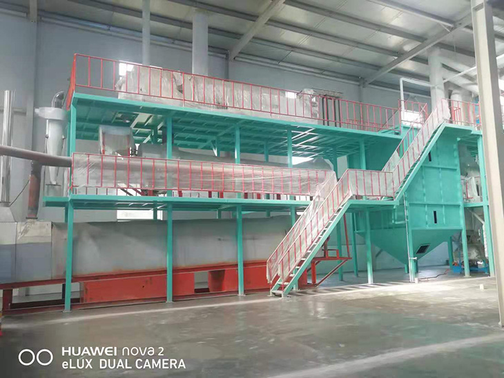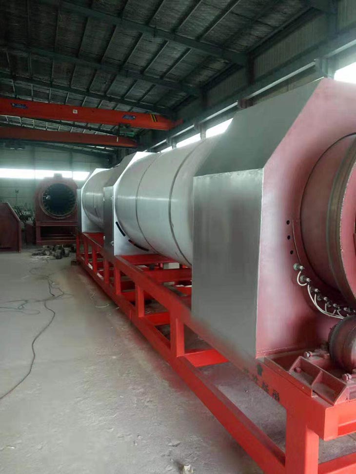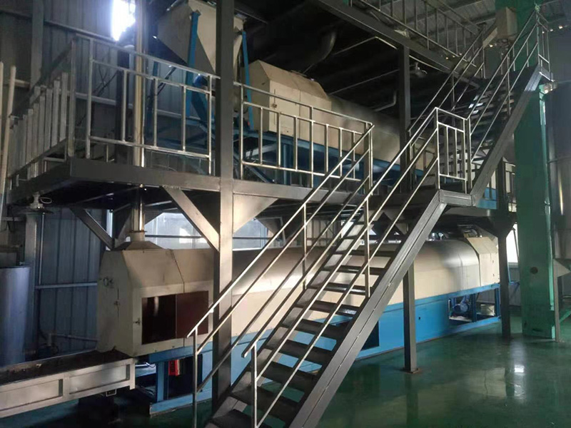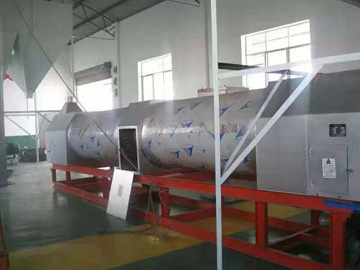 我們解決其技術(shù)問題所采用的技術(shù)方案是:一種新型環(huán)保節(jié)能熱風炒爐,由電源供電,包括第一燃燒室、第二燃燒室、熱風炒爐滾筒、存料機、自動喂料器、出料機、引風機和排潮風機,所述熱風炒爐滾筒的入口端通過自動喂料器與所述存料斗連通,所述熱風炒爐滾筒的入口端還通過風道與所述排潮風機連通,所述熱風炒爐滾筒的出口端與出料機連通,所述第一燃燒室和第二燃燒室通過風道與引風機連通,所述第一燃燒室和第二燃燒室分別位于所述熱風炒爐滾筒的下方,所述熱風炒爐滾筒軸心線與水平面形成2°到8°的夾角,所述第一燃燒器和第二燃燒器安裝位置在相應燃燒室的前端或者相應燃燒室的兩個側(cè)面。我們設備取消了原熱風炒爐所配套的單獨熱風爐、彎段風道或直段風道;在炒爐滾筒下方設計安裝兩份熱風燃燒室,用燃燒器產(chǎn)生的熱風直接對滾筒進行加熱,最大限度地縮減了炒爐散熱環(huán)節(jié)和面積,從而實現(xiàn)炒爐連段式加熱。與現(xiàn)有設備相比,我們公司設備充分利用了熱風釋放的熱量,減少了熱量損失,單噸油料或糧食加工消耗添人氣甚至能降低到25nm3,降低了17%,節(jié)能降耗效果非常明顯,得到了客戶的一致好評。與現(xiàn)有設備相比,同等日加工量,所配兩臺燃燒器合計功率比現(xiàn)有設備燃燒器功率下降20%-30%,熱風設定溫度有750-800℃下降到400-500℃,明顯延長了炒爐的使用壽命。第一燃燒室和第二燃燒室的功能各不相同,工作溫度也不一致,第一燃燒室和第二燃燒室能夠?qū)崿F(xiàn)分段加熱溫度控制,更加靈活與合理,安全可靠,便于操作與控制。